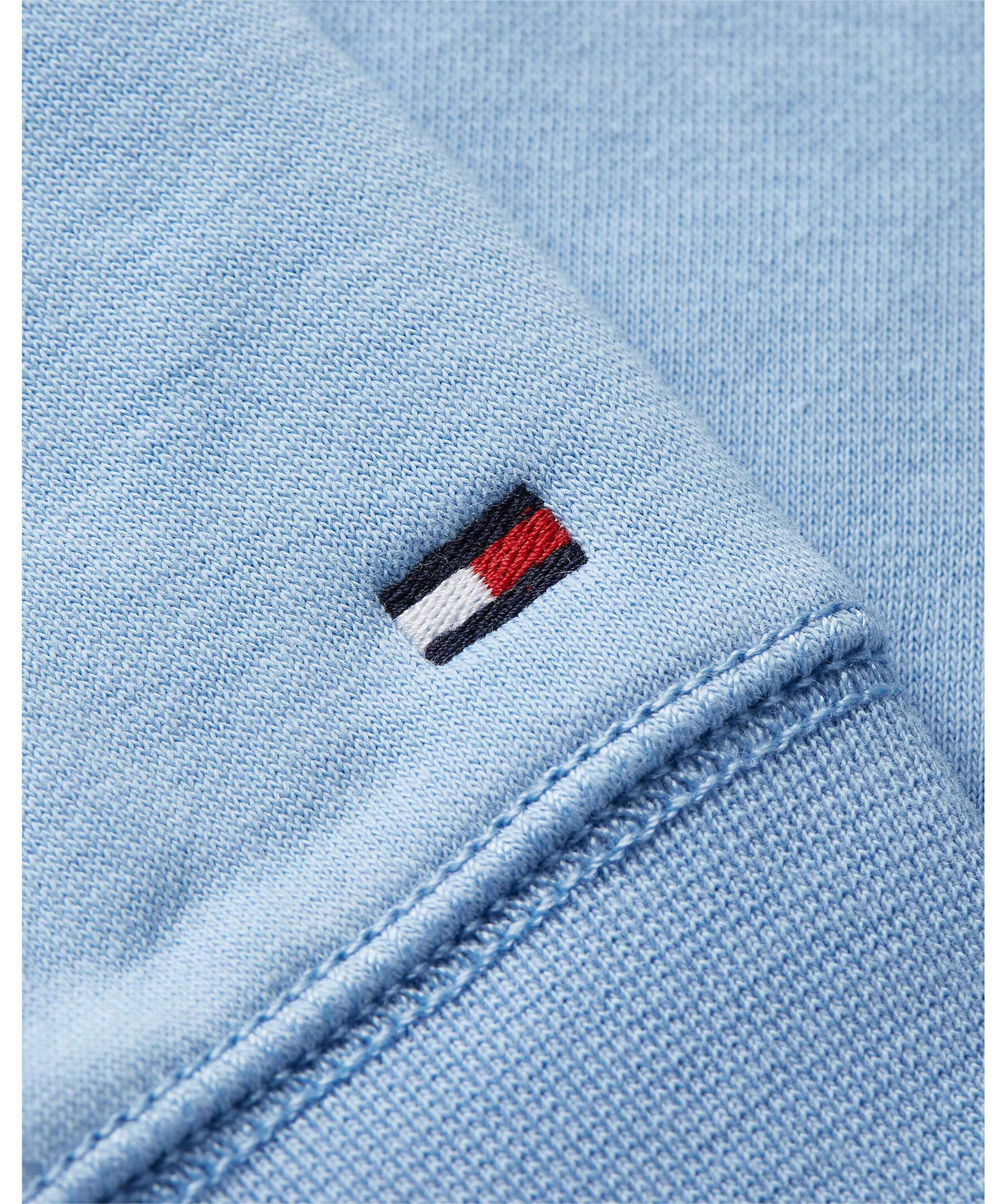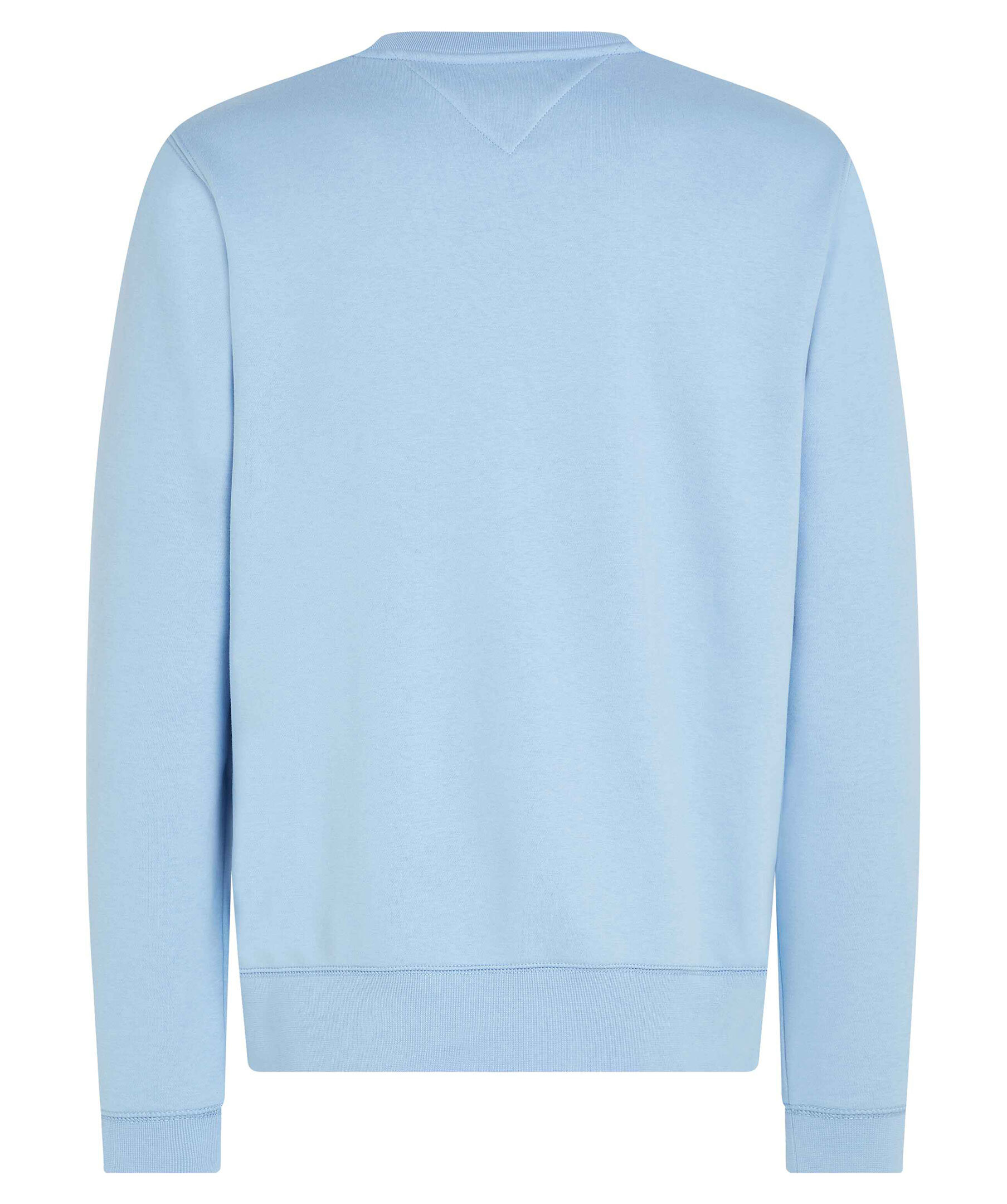Ljusblå sweatshirt från Tommy Hilfiger. Logotyp broderad över bröstet och en liten broderad flagga vid vänster ärmslut. rundad halsringning och släta muddar.