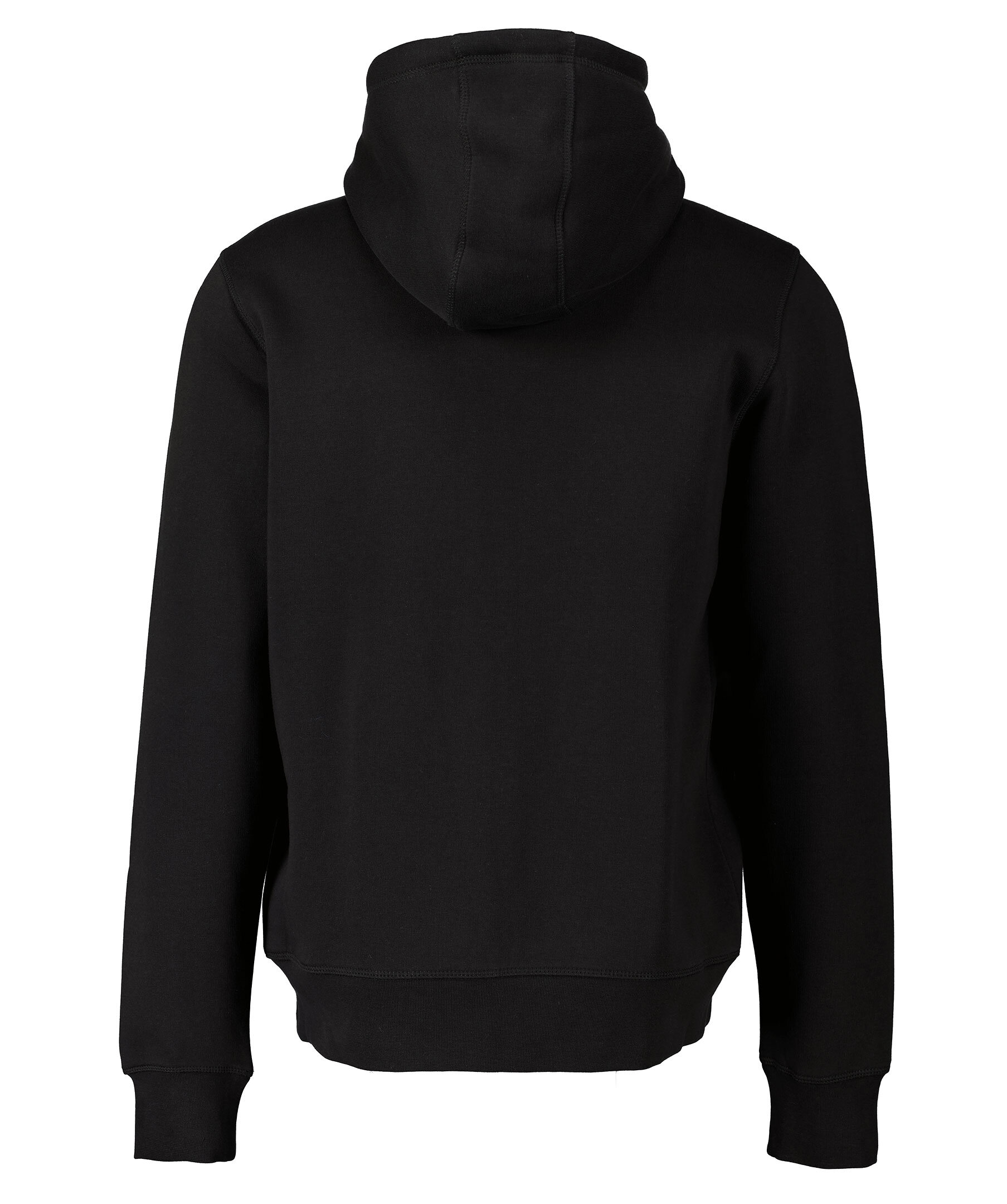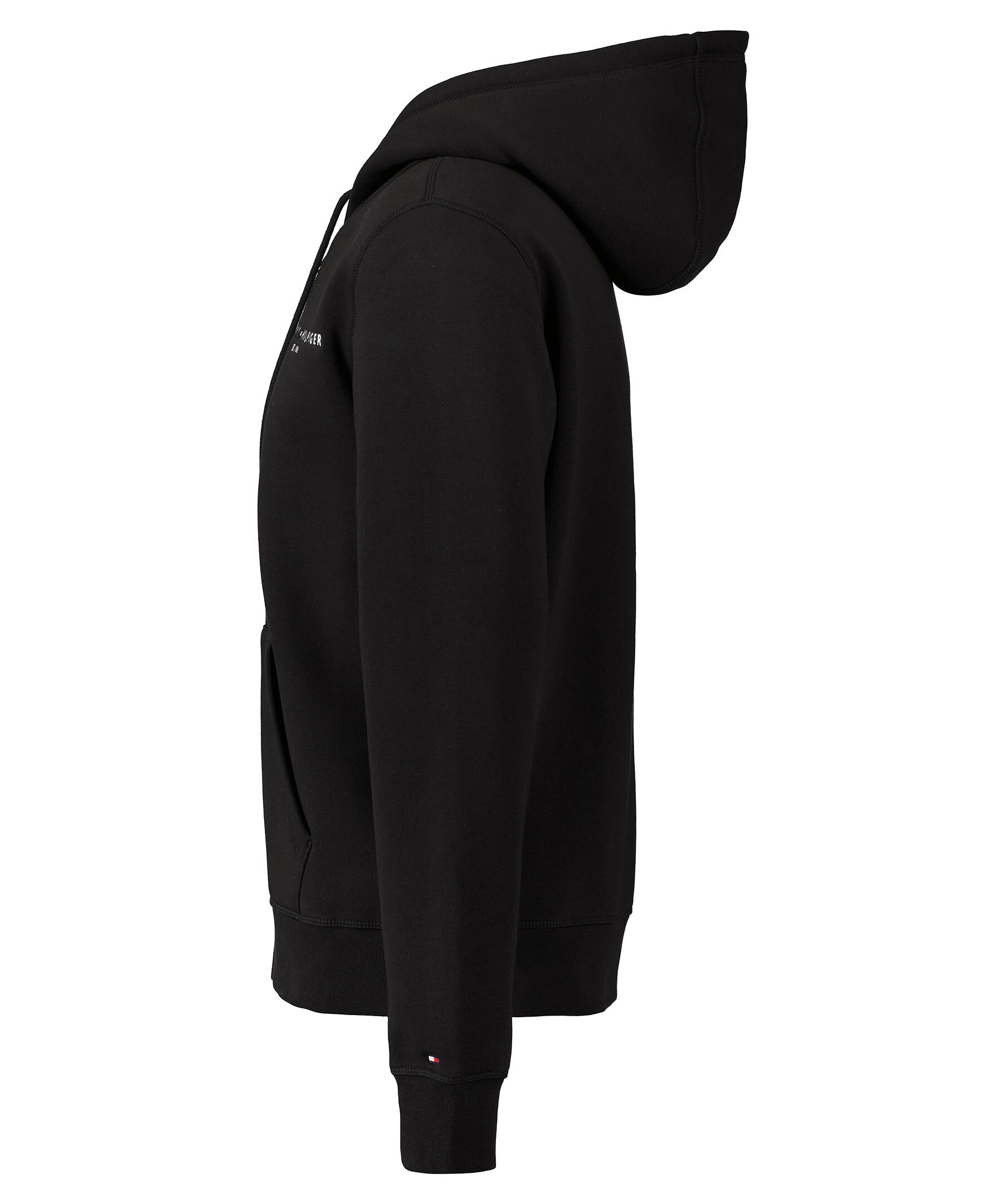 Svart hoodie med snörning i luvan från Tommy Hilfiger. Tillverkad i bomullsmix och har en mjuk, borstad insida. Vit, broderad logga på vänster sida av bröstet, fickor på magen och ribbade muddar.