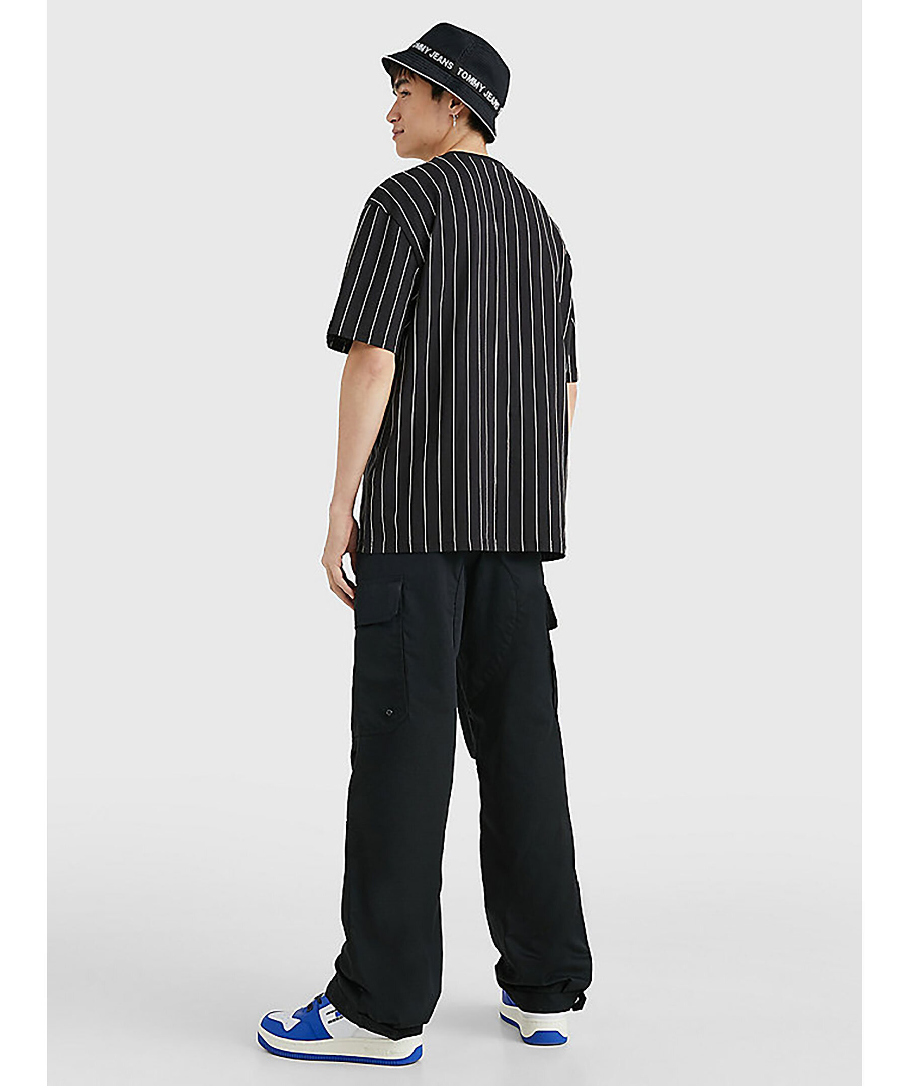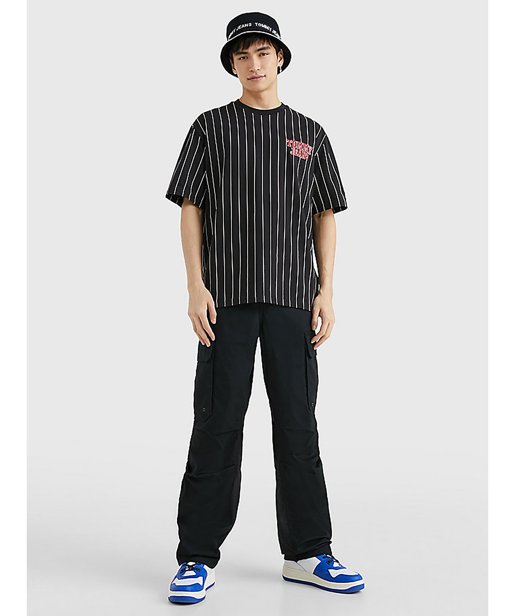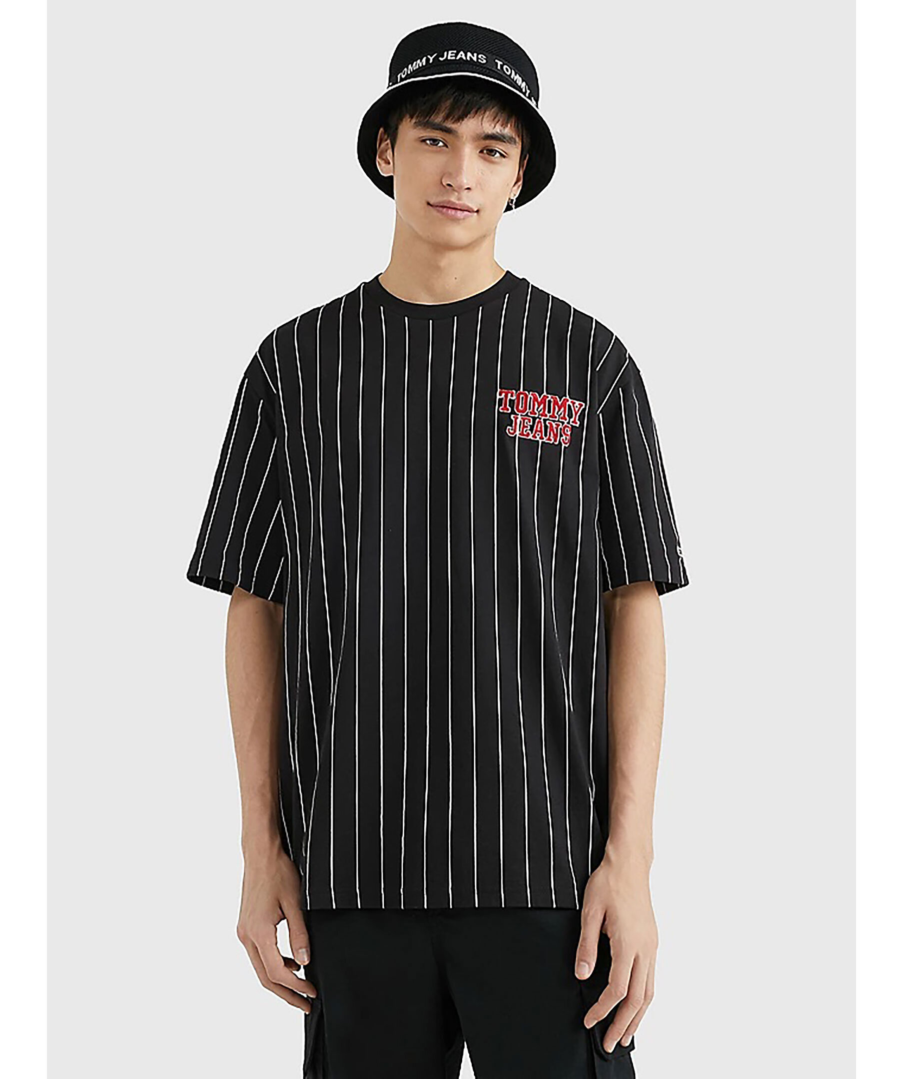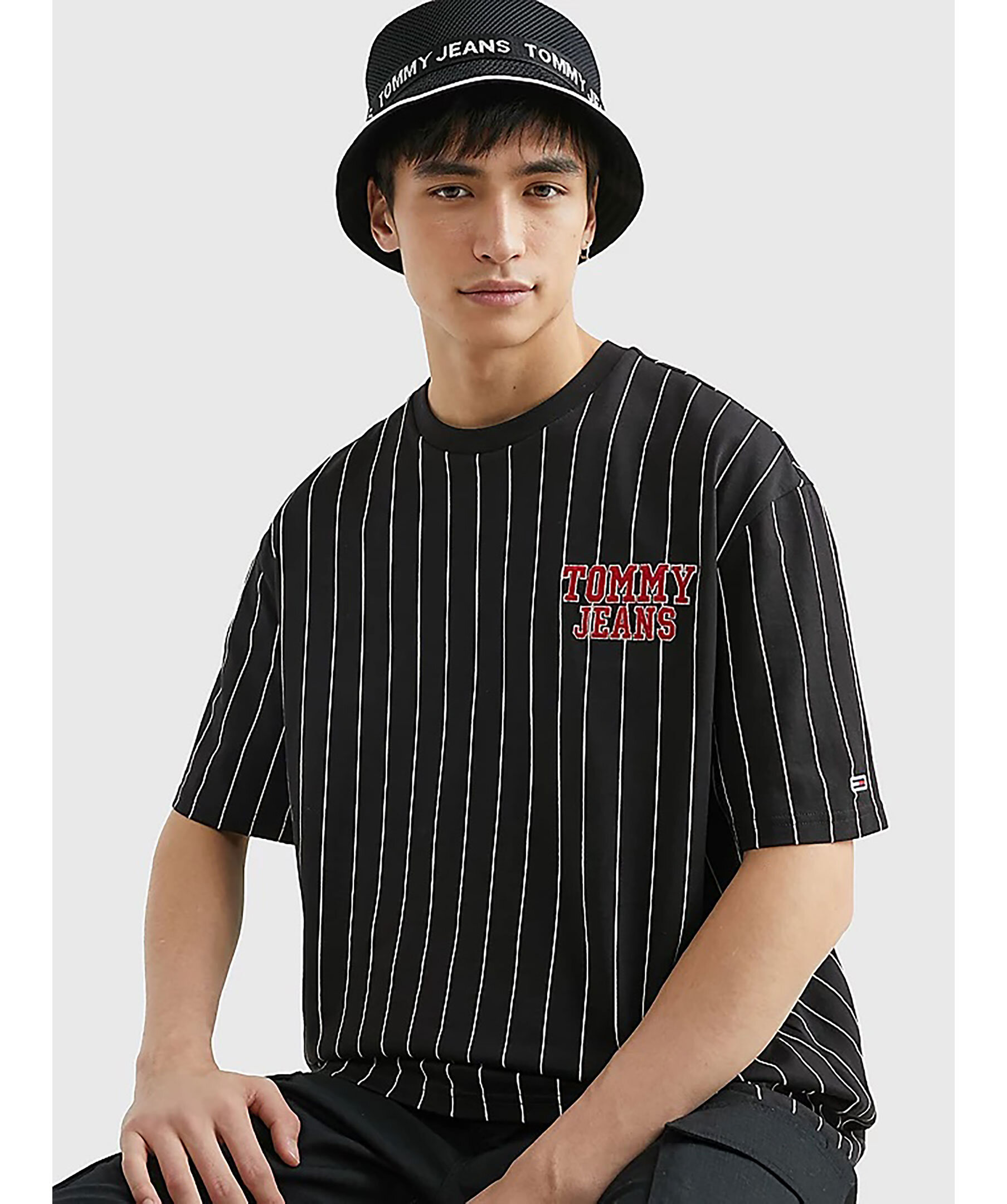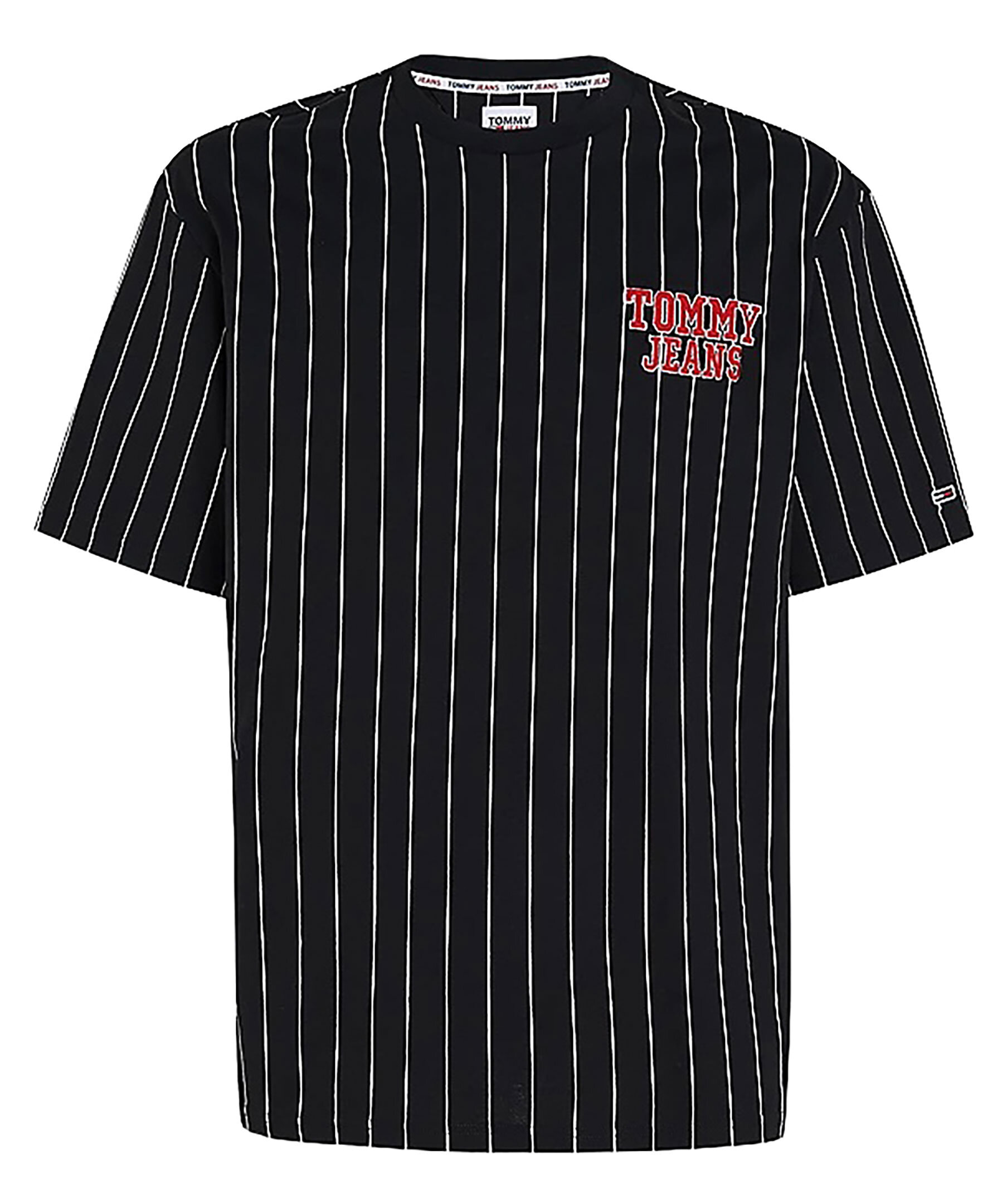 Svart kritstrecksrandig t-shirt från Tommy Jeans. Tillverkad av ren bomull och har en oversize modell samt något tappade axlar. Röd logotyp tryckt på vänster sida på bröstet. Modellen är 186 cm och bär storlek M.
