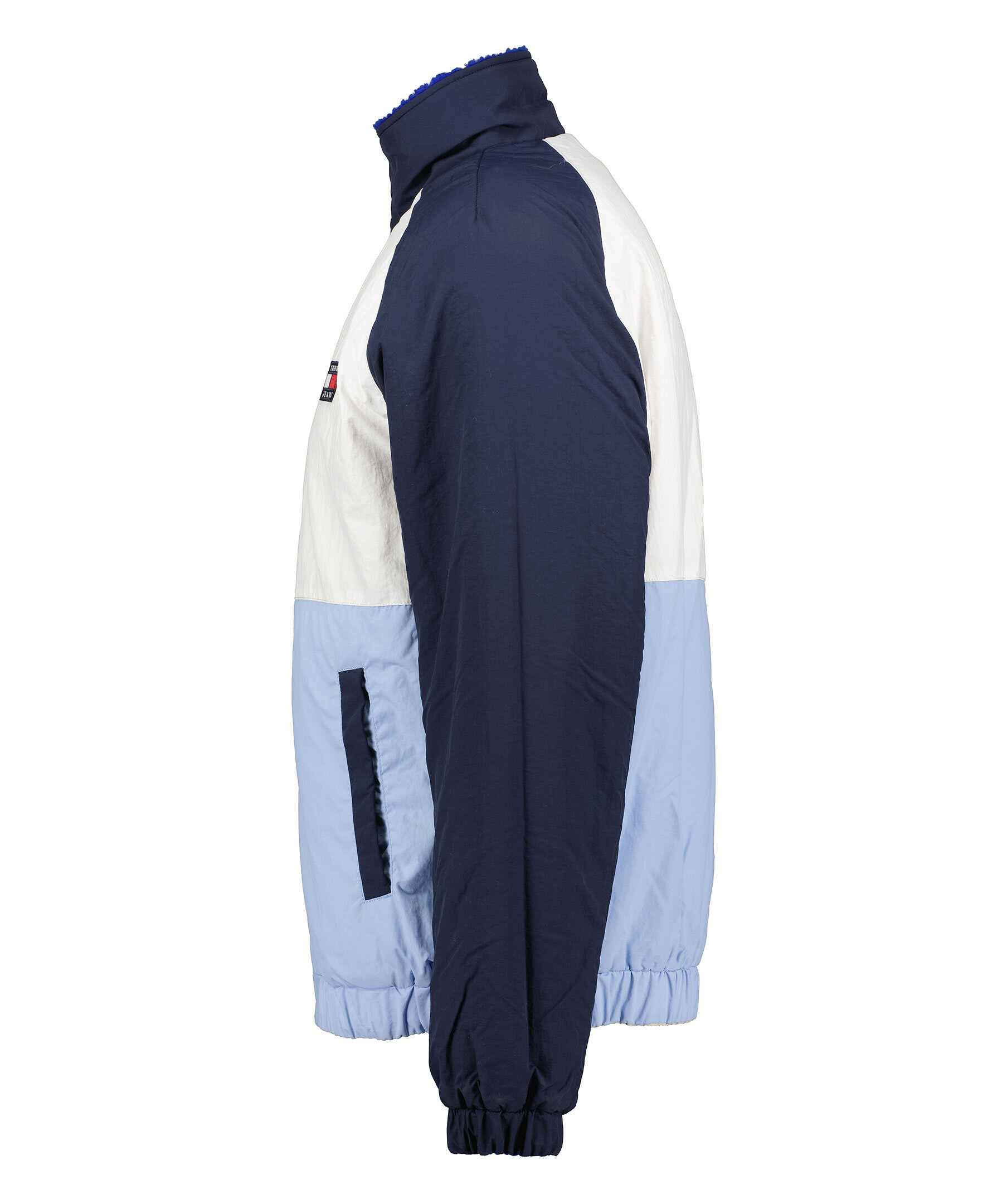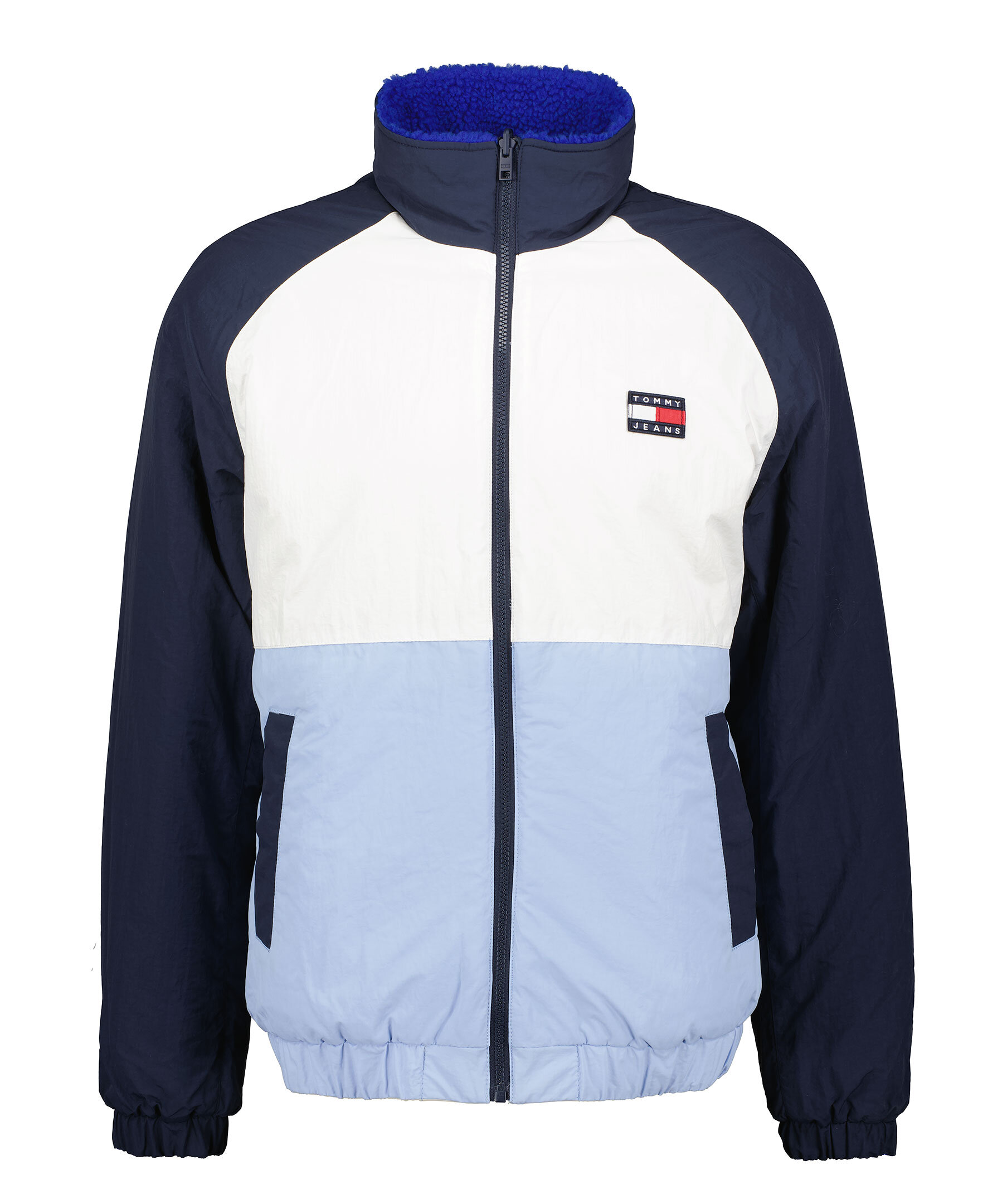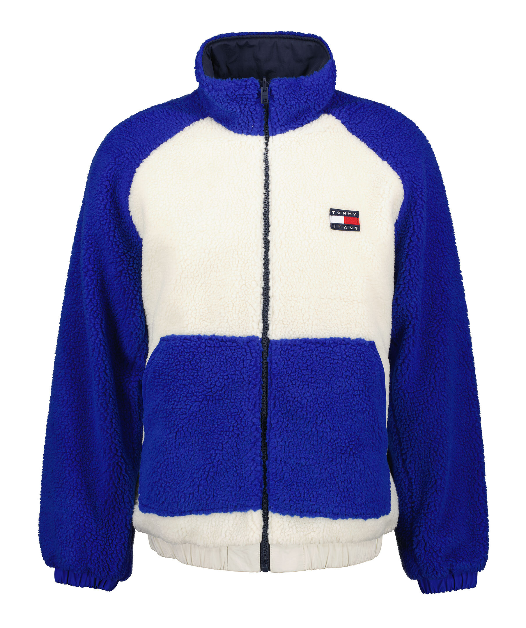 Blå och vit jacka från Tommy Jeans. Jackan är reversible och är på ena sidan i ett teddy-material med koboltblåa ärmar, krage samt fickor och på andra sidan marinblåa ärmar samt krage, ljusblå nederdel och resterande vitt. Båda sidorna har en broderad logotyplapp på vänster sida på bröstet. Jackan stängs med dragkedja.