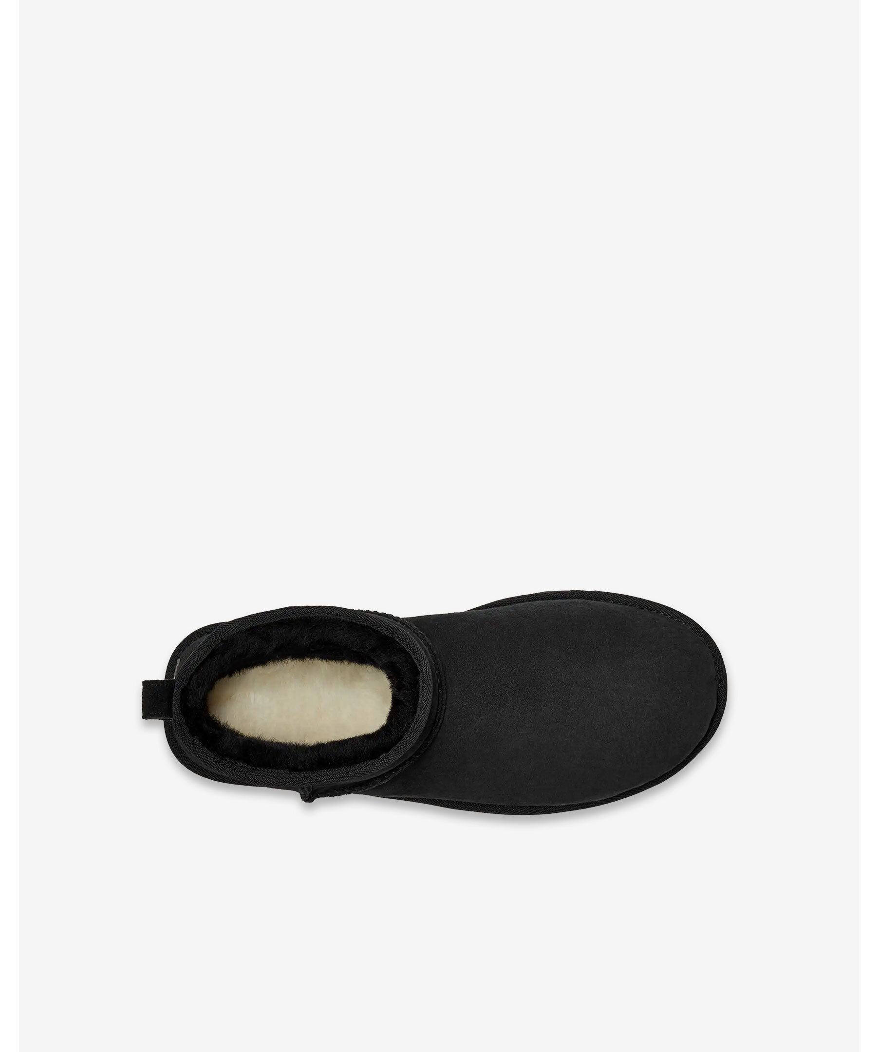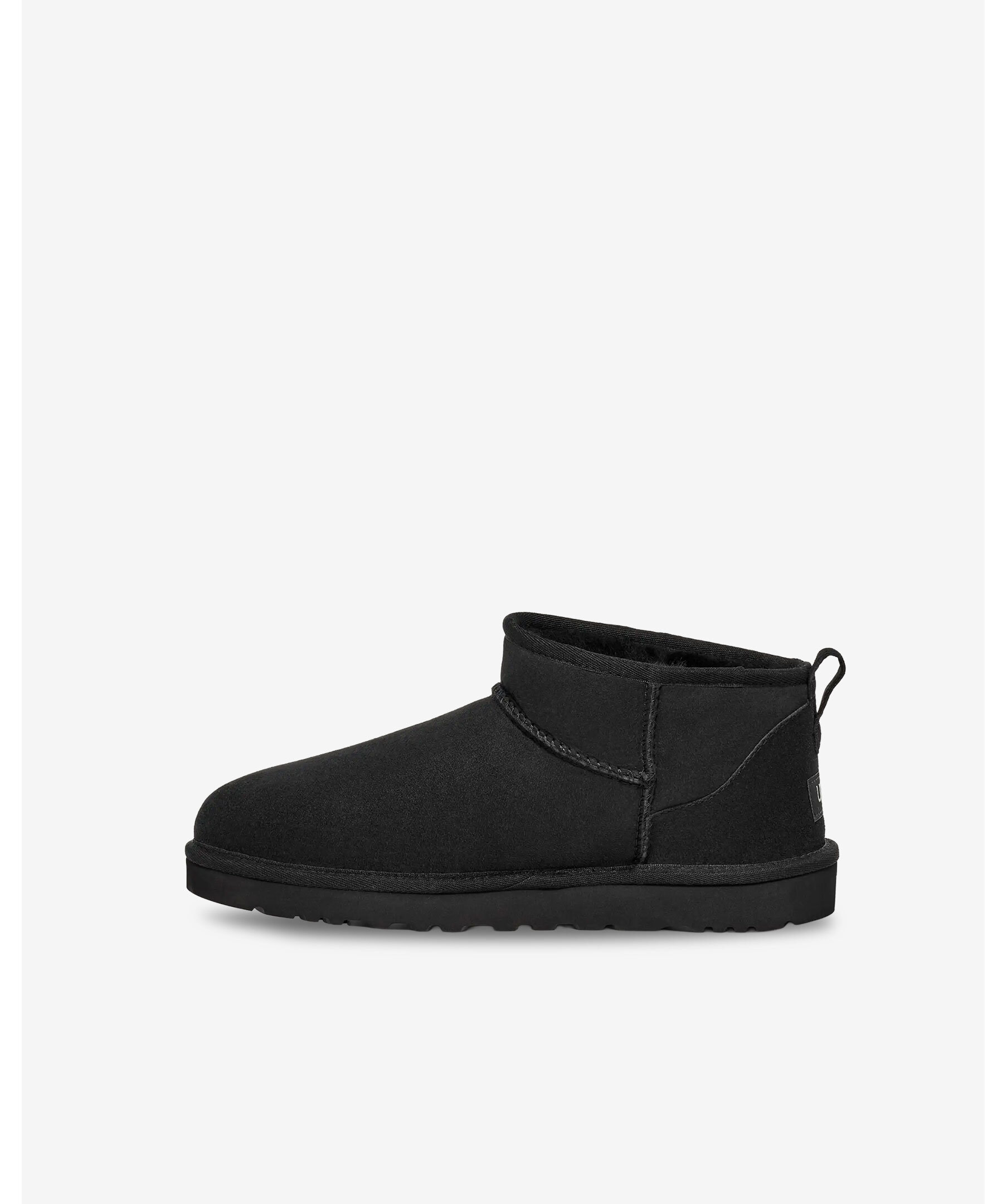 Svarta, fodrad sko från UGG. Classic Ultra Mini är en uppdaterad variant av UGGs mest ikoniska siluett med en lägre skafthöjd. Förbehandlad med vattenavstötande behandling för att den ska se bättre ut längre. Tillvekad i fårskinn, ultramjukt UGGplush™-foder och har en flexibel, lätt sula i gummi. Asymmetrisk överlinje, overlocksömsdetaljer på sömmarna, dragflik bak och läderhäletikett med präglad UGG®-logotyp på hälen. 3,5" skafthöjd. De är inte tillverkade för slaskigt och blött klimat och rekommenderas att inte användas när det är blött ute. Man behöver behandla skorna med skoimpregnering regelbundet för att skorna ska hålla längre och stå emot väta bättre.
