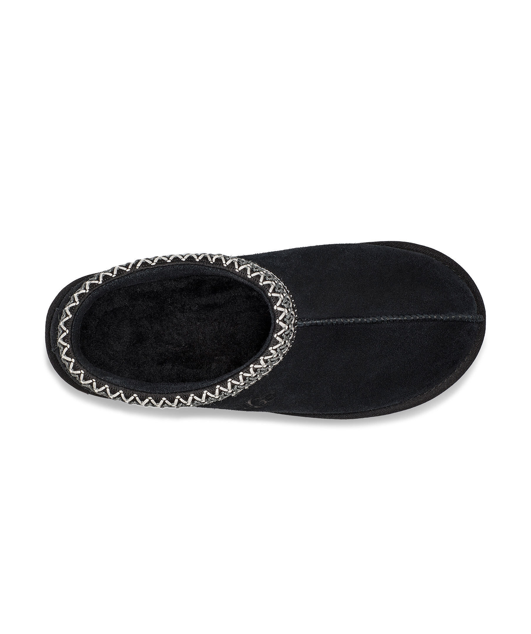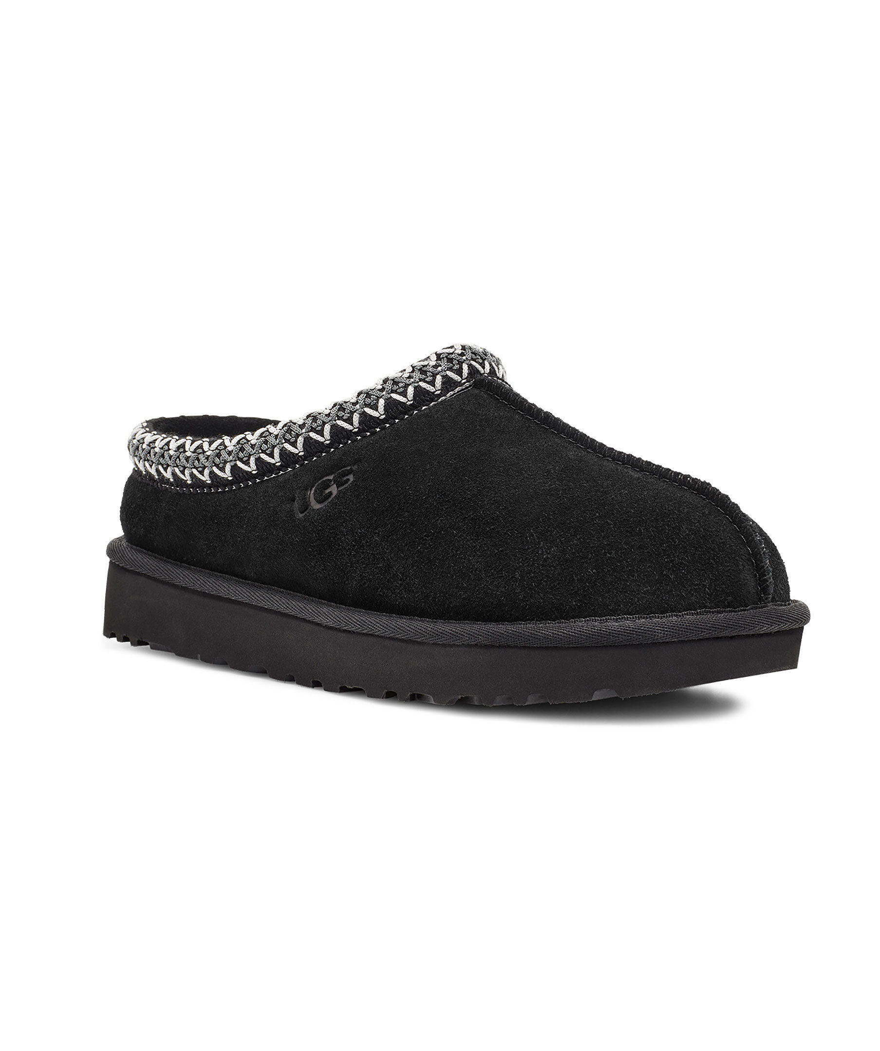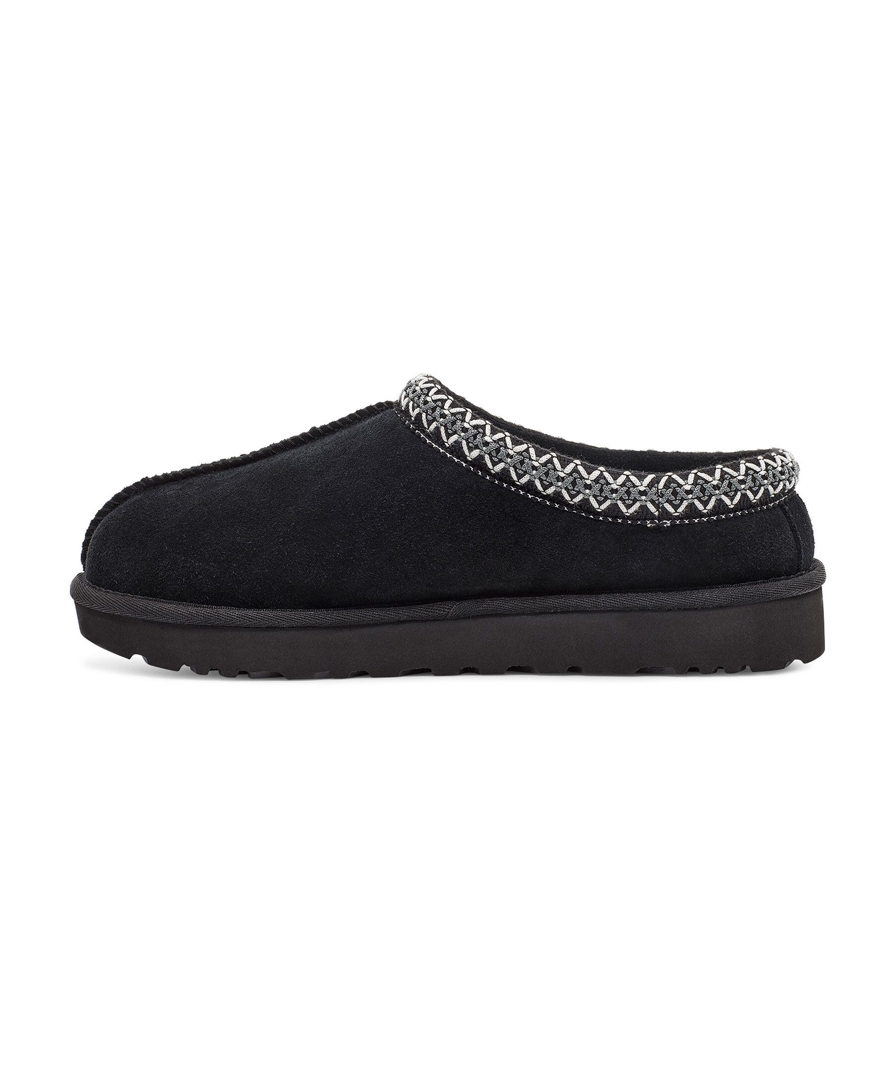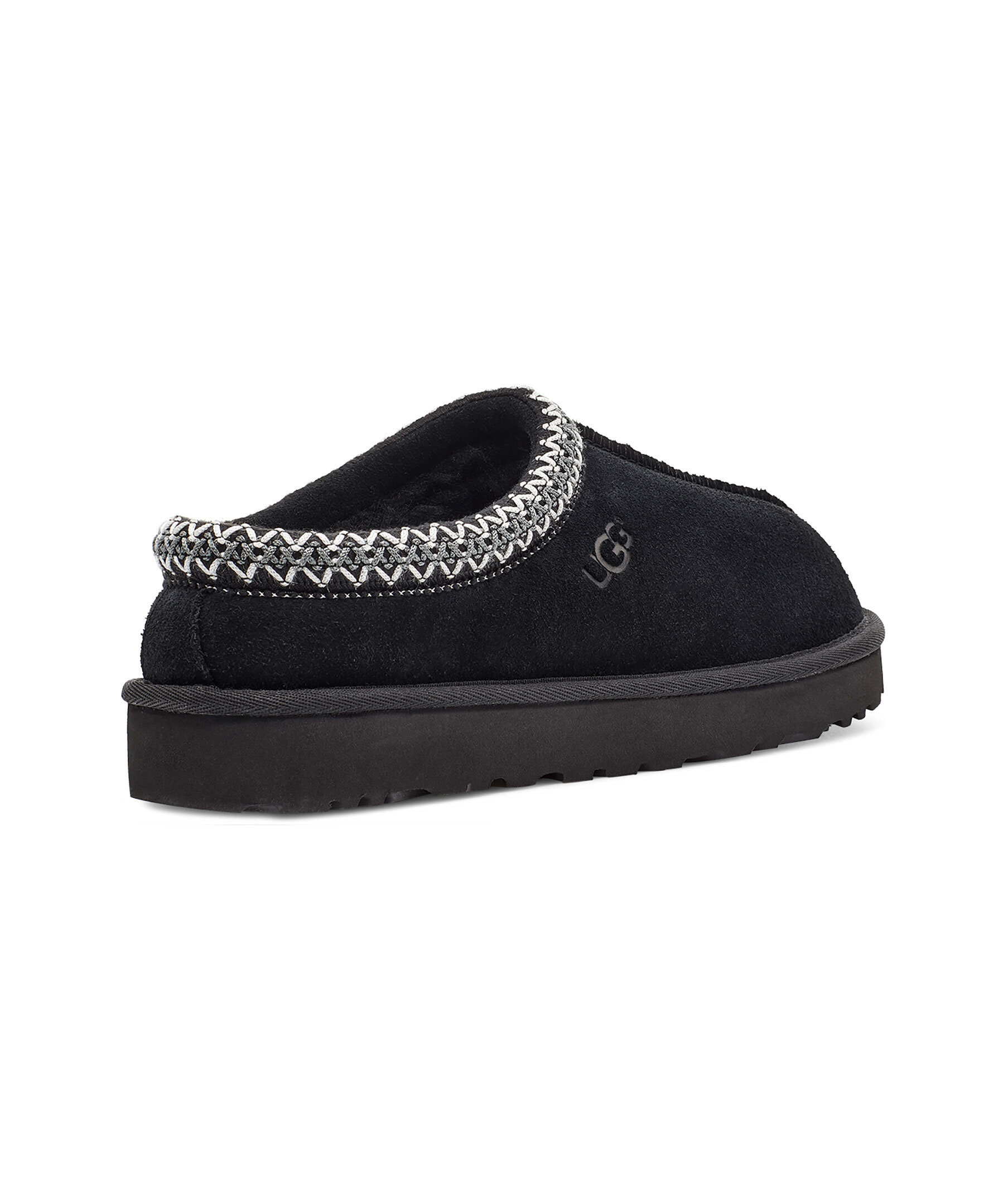Svarta tofflor i mocka från UGG. Fodrade med mjuk ull. Grått och vitt, flätat mönster vid tofflans öppning. Skon passar utmärkt att använda till ute- och inomhusbruk. Sulan är den klassiska lätta UGG sulan. Skon är liten i storlek, vi rekommenderar att gå upp en storlek.