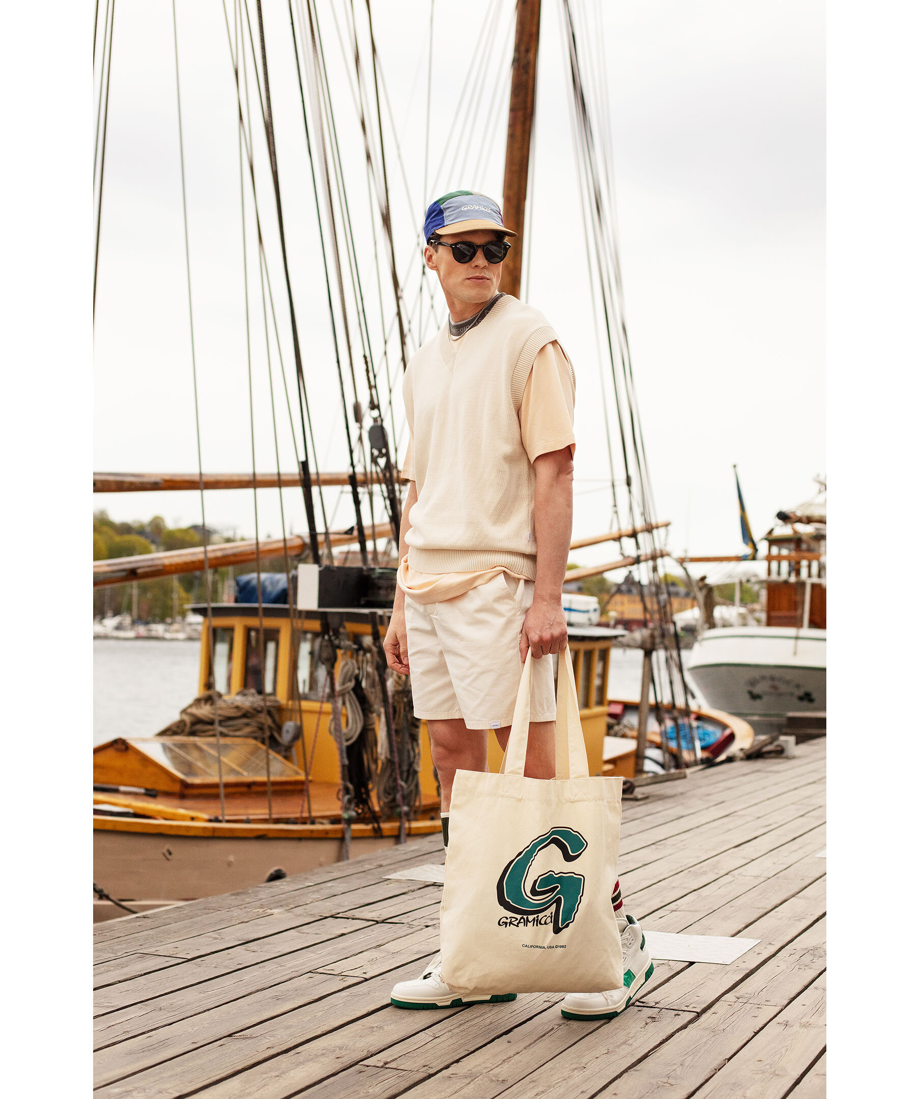 Stor tygkasse från Gramicci gjord i ett naturfärgat bomullscanvas. Tjocka bärband, stor logotyp på ena sidan och en liten praktisk innerficka. Perfekt väska att använda vid alla sorters tillfällen till vardags. Väskan är 46cm bred, 45cm hög och 9cm djup.
