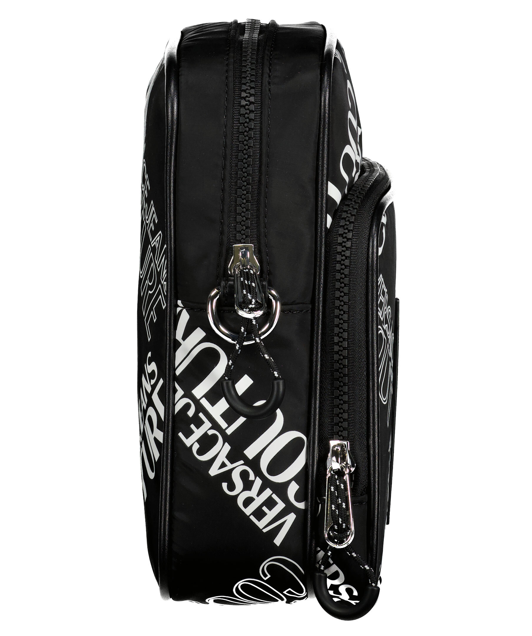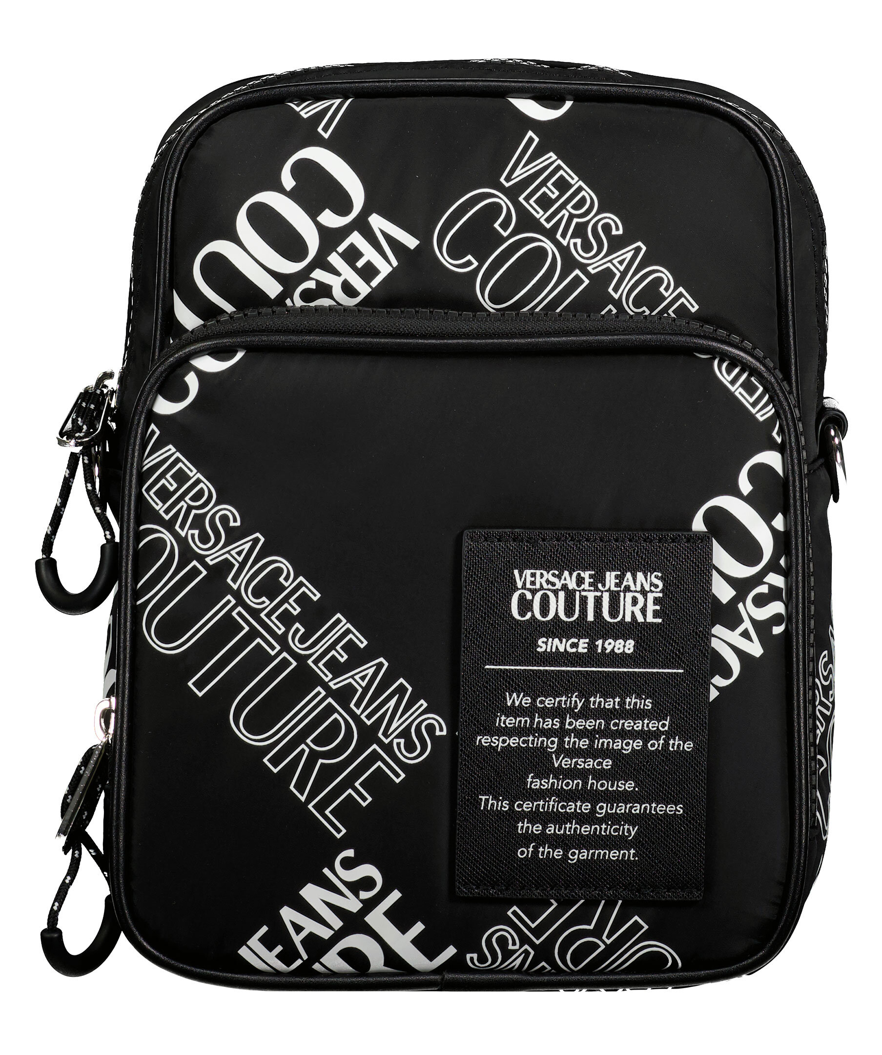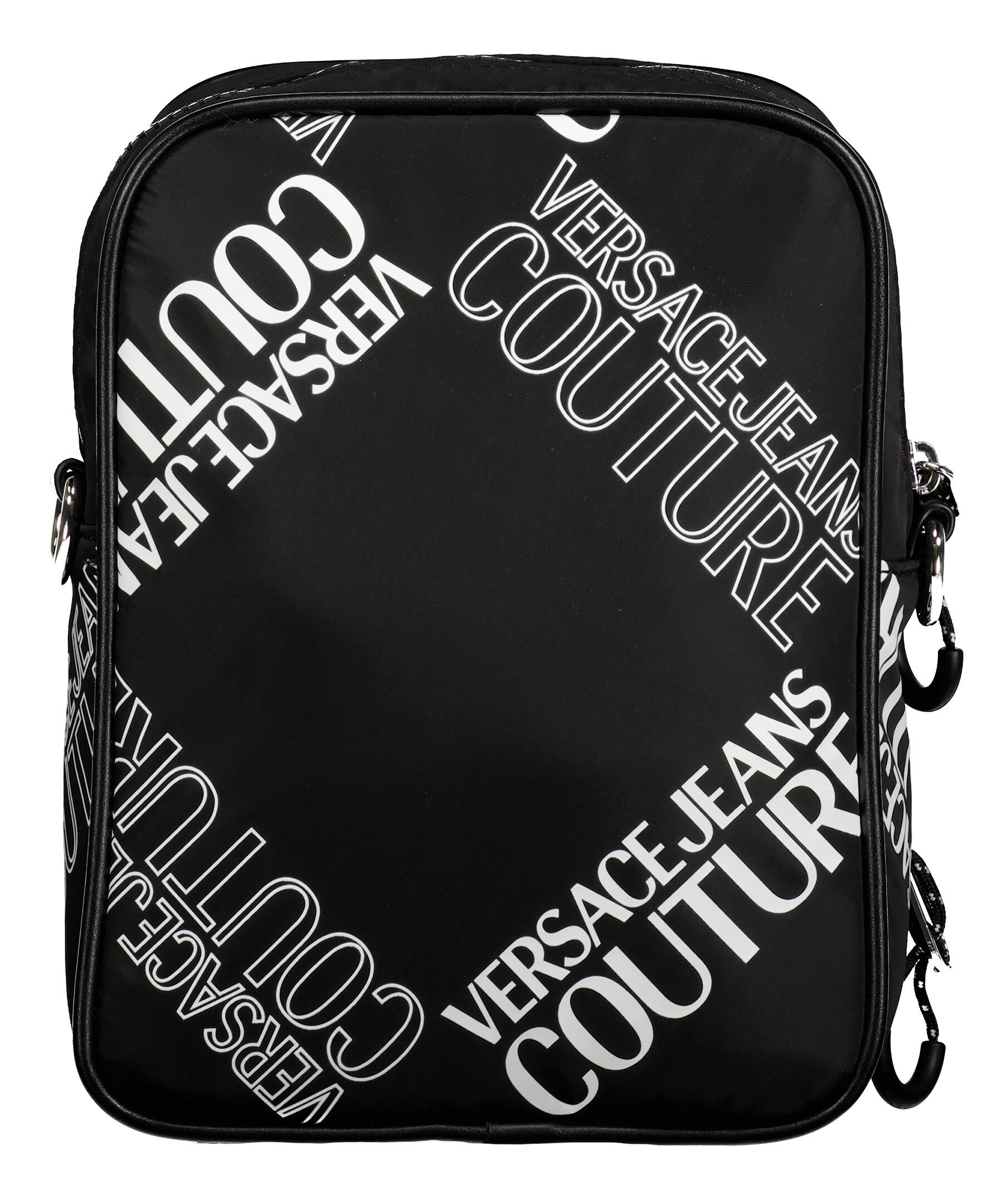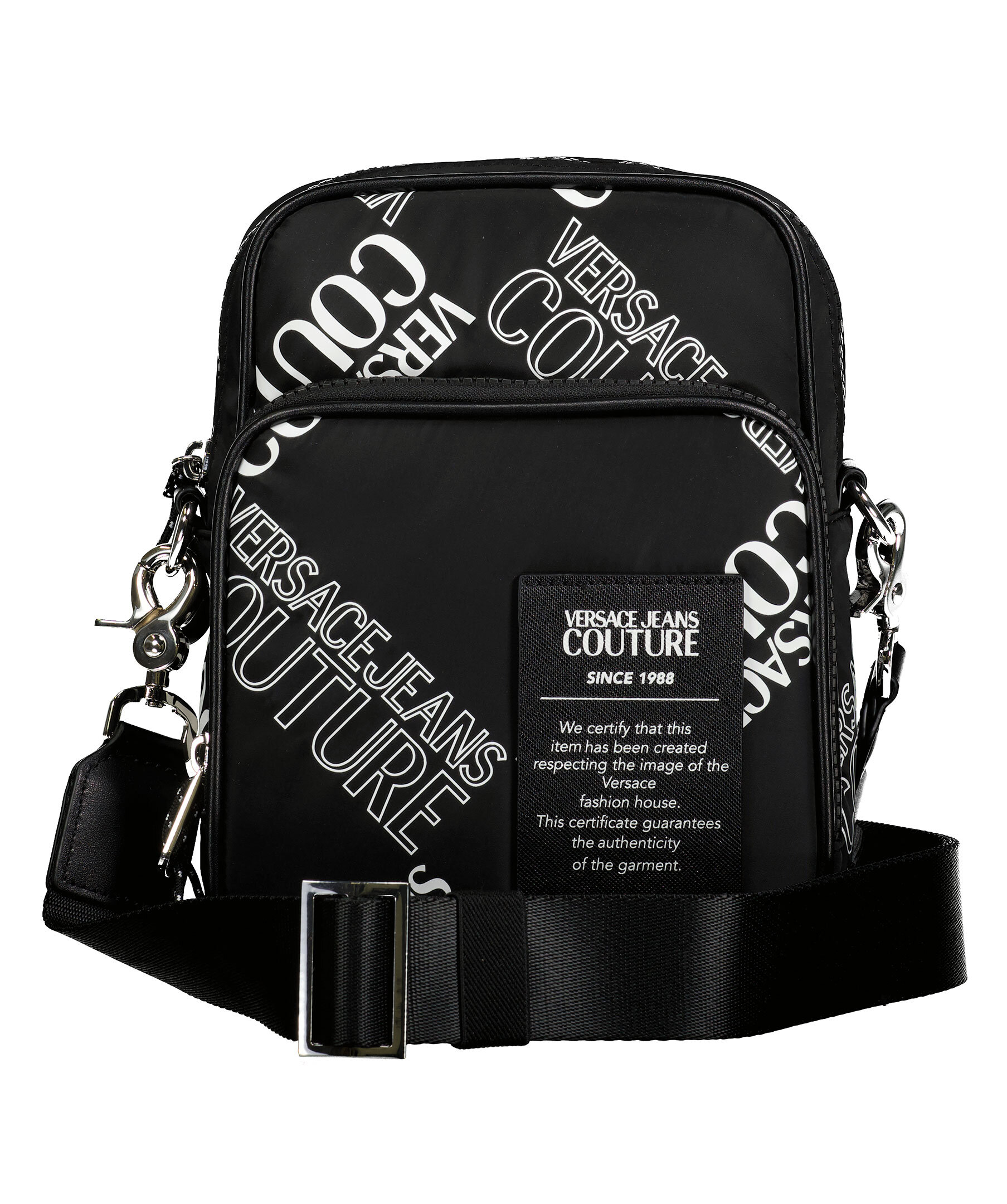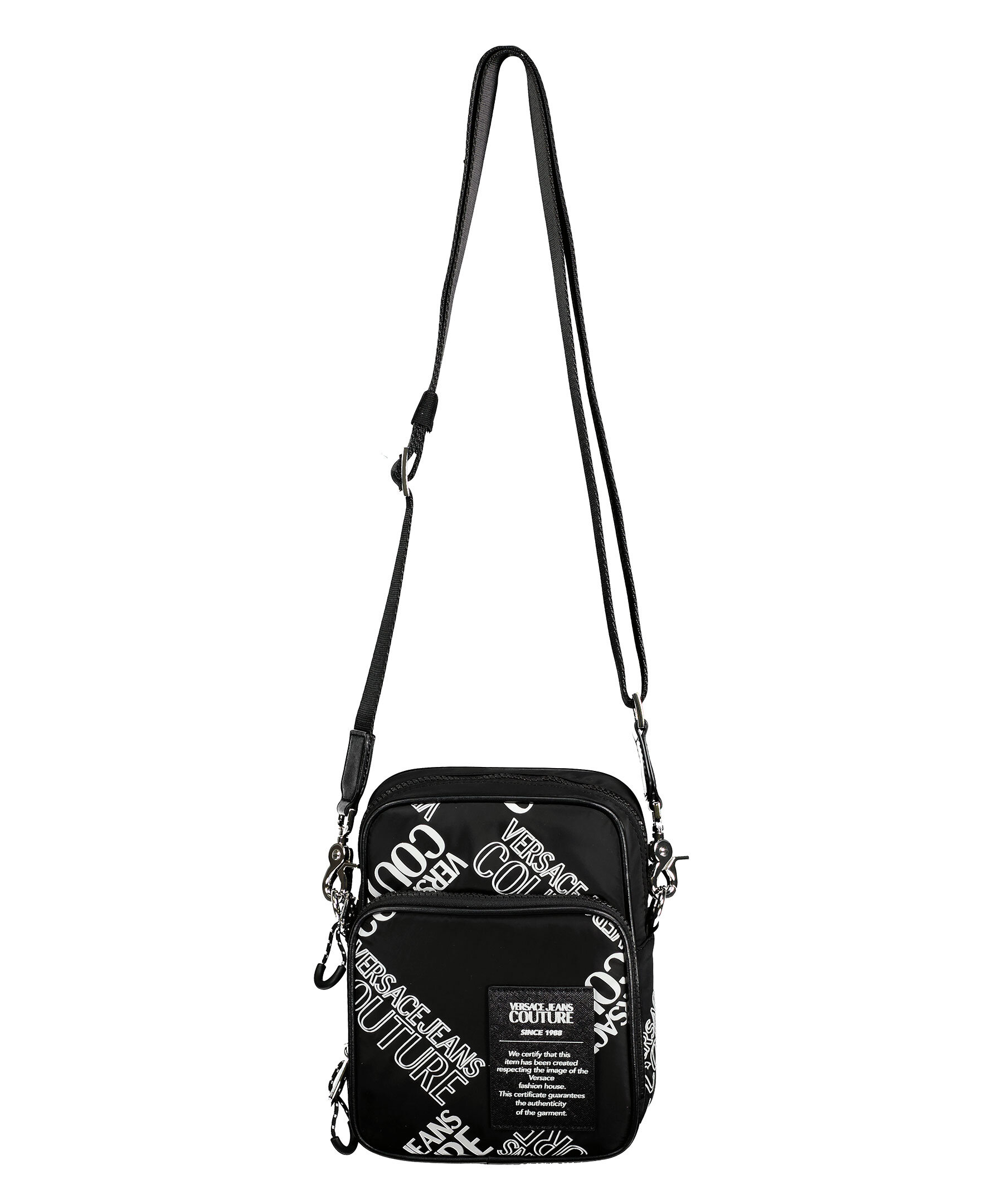 Svart, mönstrad axelremsväska från Versace Jeans Couture. Svart patch i syntetiskt läder med logga och text fram, reglerbar och avtagbar axelrem som fästs i 2 öglor på baksidan. Väskan stängs med dragkedja och har en ficka med dragkedja på utsidan samt en öppen ficka på insidan. Silverfärgade detaljer på öglor hakar och dragkedja. Bredd: 17 cm, Djup: 8,5 cm, Höjd: 22 cm. Axelbandsrem: 93-162 cm.