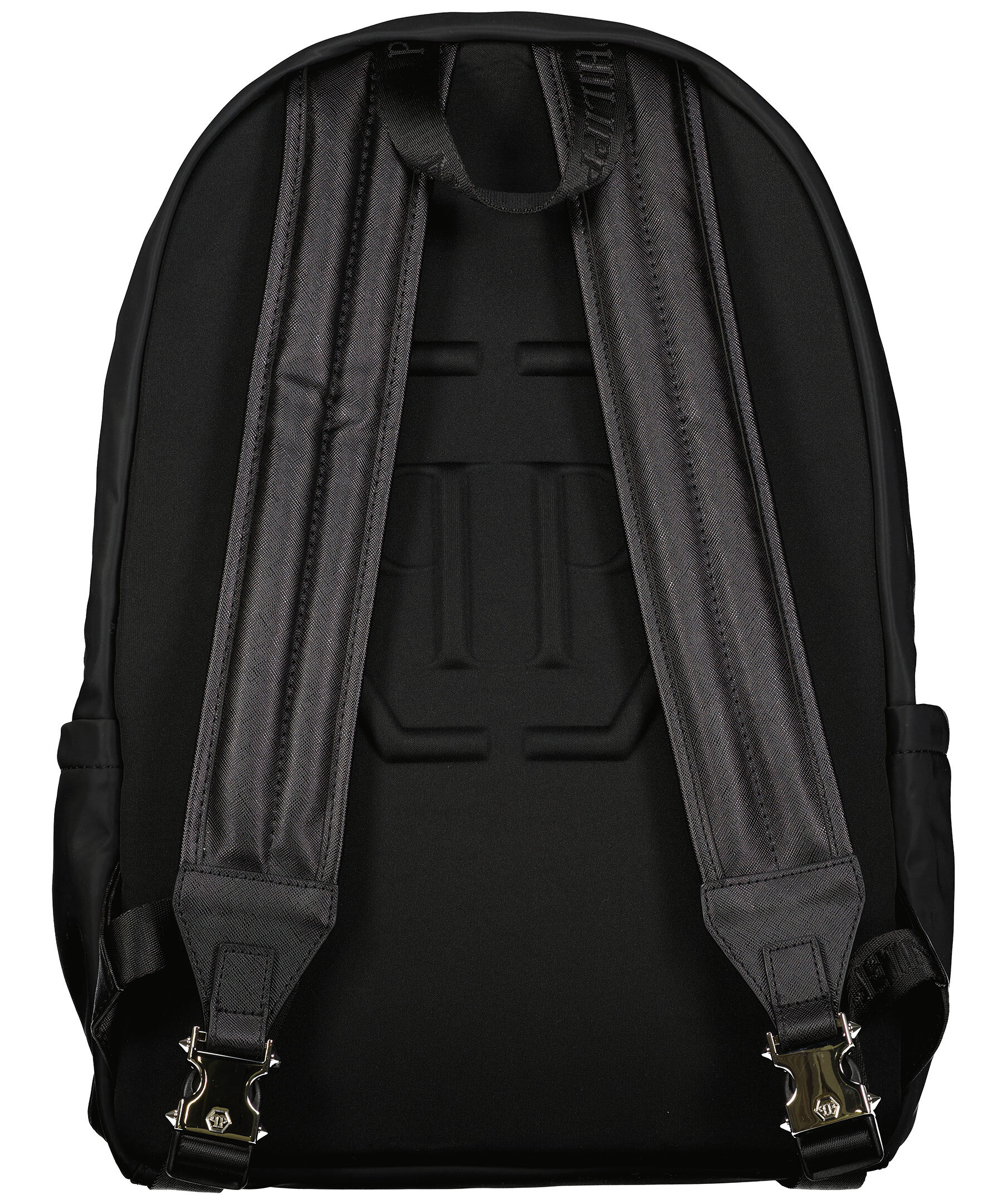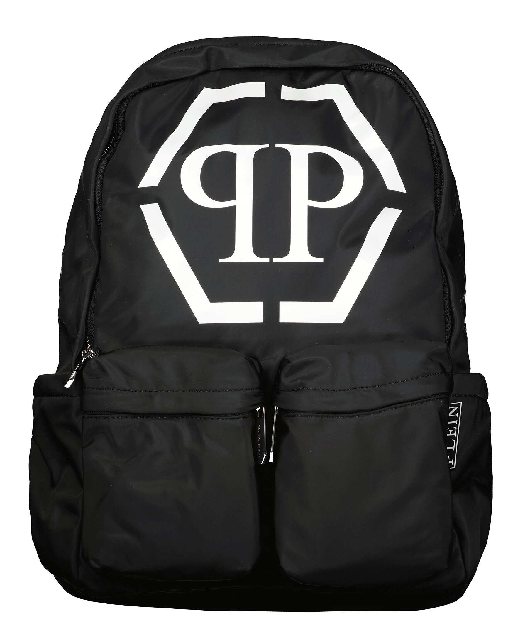 Svart ryggsäck från Philipp Plein. Fack för dator i huvudfacket. Två mindre fack som stängs med dragkedja på ryggsäckens framsida. Öppna fack i sidorna. Husterbara axelremmar. Logotyp i vitt på ryggsäckens framsida.