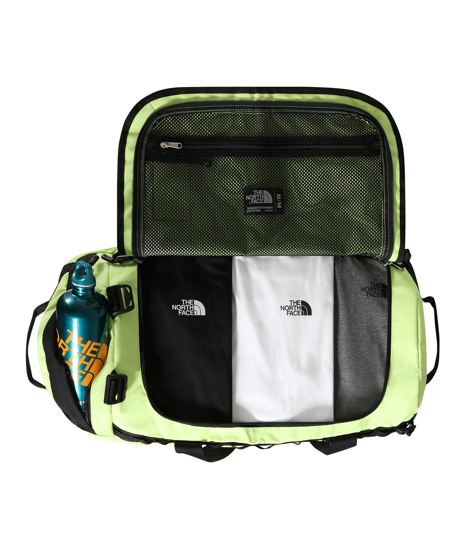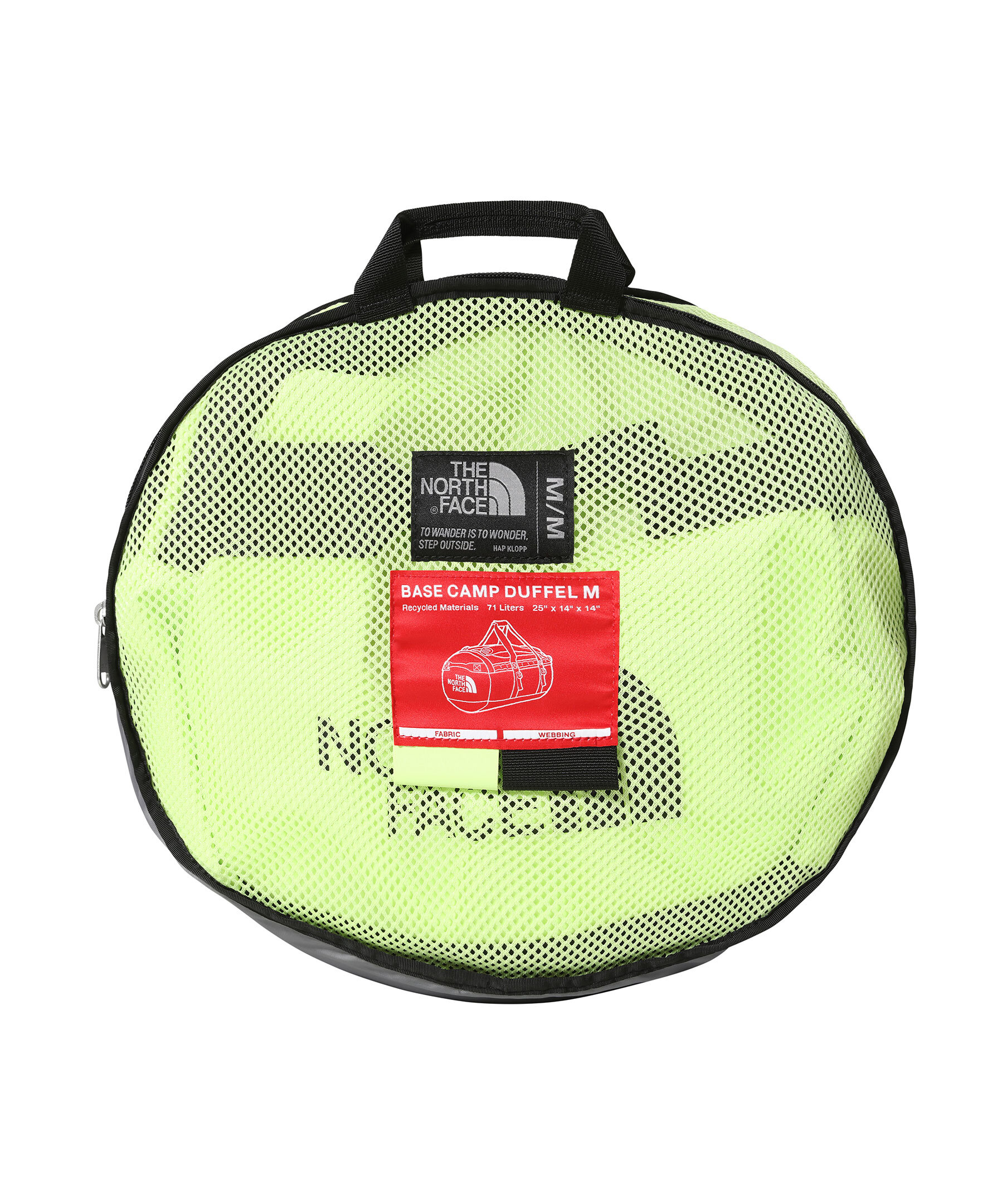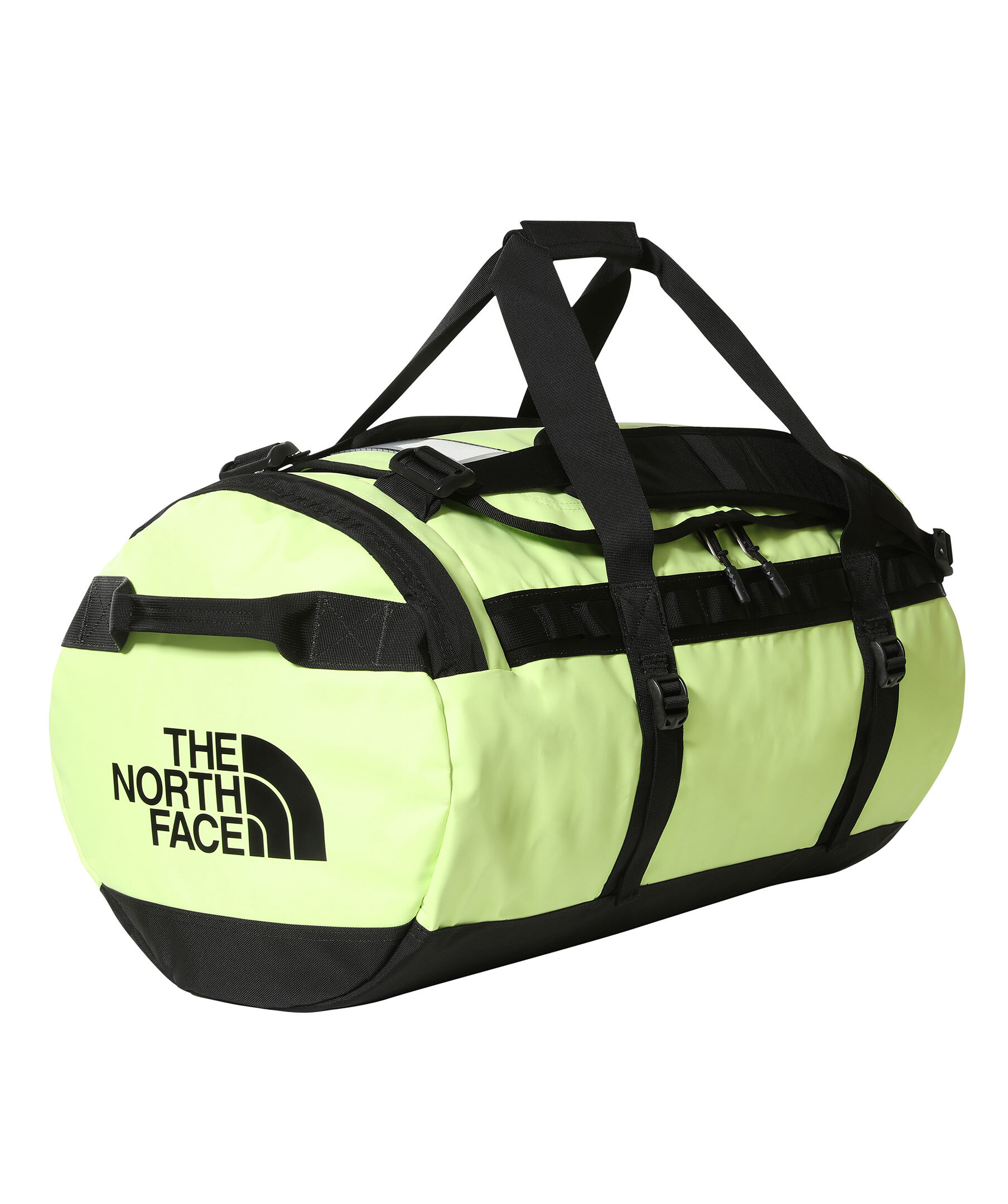 Neongrön och svart duffelväska från The North Face. Tillverkad av återvunna och vattentäta material. Slitstark och riktigt praktisk med massor av genomtänkta funktioner som gör den till en upptäcktsresandes bästa vän. Använd den som en duffelväska när du reser med de två vadderade sidohandtagen, eller bär den som en ryggsäck med de avtagbara, justerbara ergonomiska axelremmarna när du förflyttar dig.
