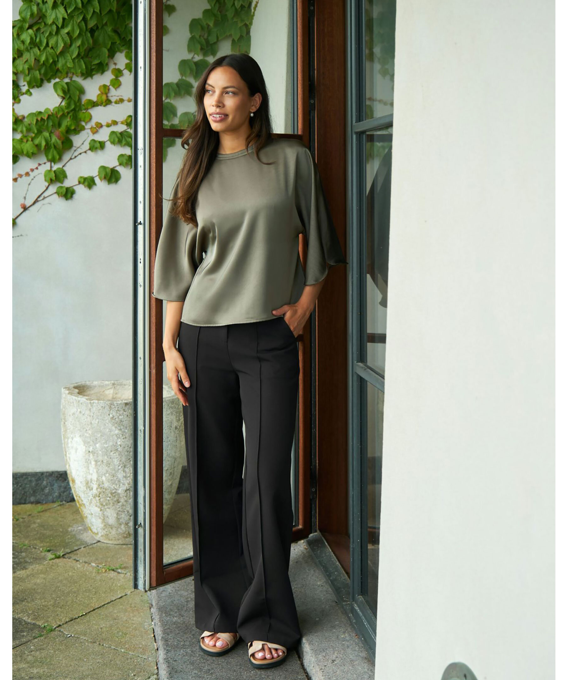 Sury Suit Pants från Neo Noir är byxor med mid-rise och vida ben i en mjuk och följsam kvalitet. De är designade med pressveck fram och bak för en elegant siluett. Midjebandet justeras med resår på insidan för bekväm passform.