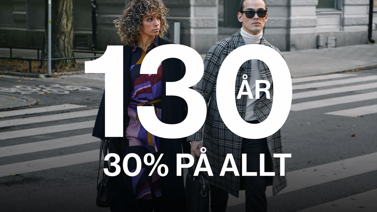 Vi fyller 130 år och vill fira det med dig med 30% på hela sortimentet! Upptäck ett brett sortiment av jackor, västar, skjortor, skor, väskor, tröjor, blusar och mycket mer.
